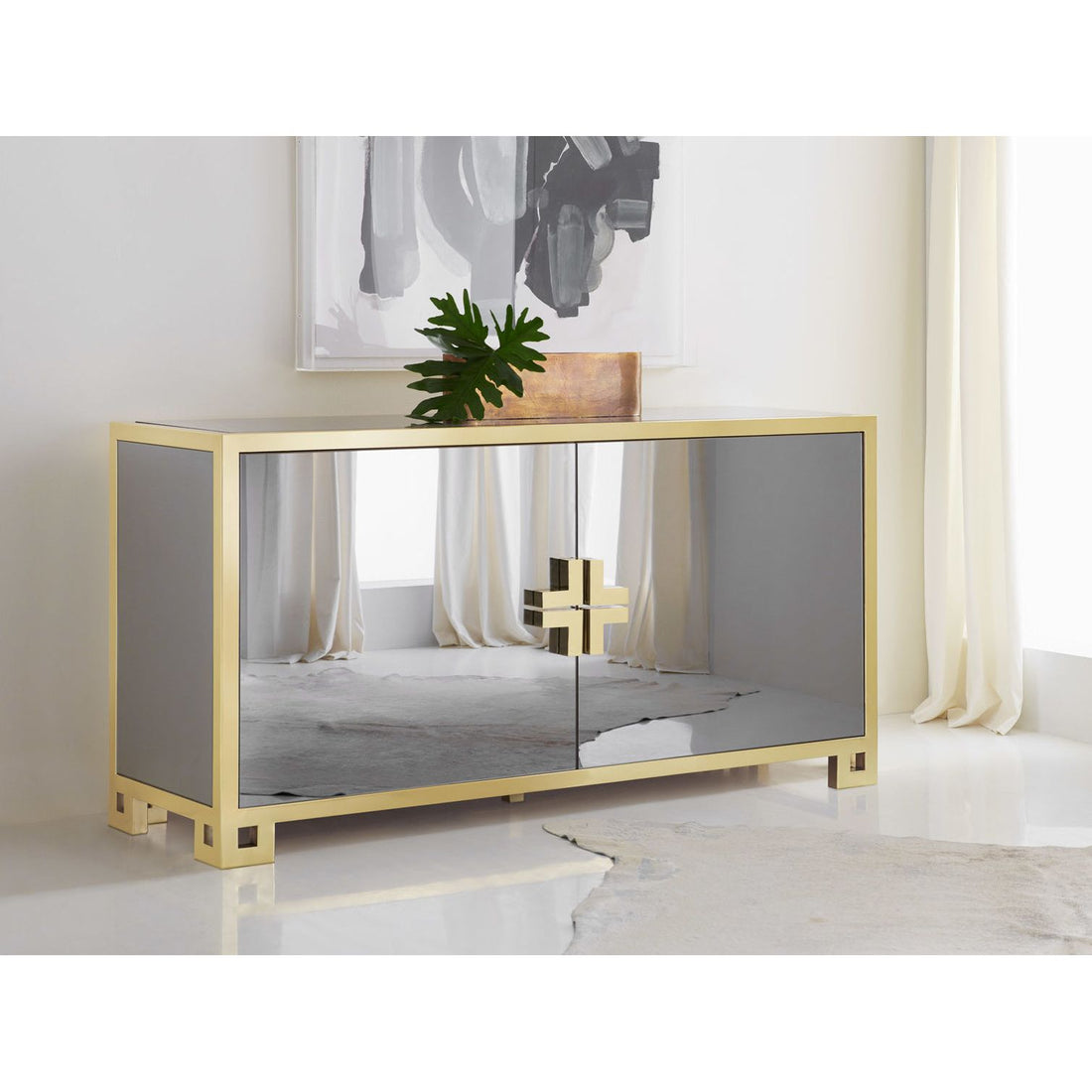 Smoked Mirror Credenza Dimensions: 67w x 22d x 35.5h Features: Solid Brass Accents Materials: Smoked Mirror w/ Gold...