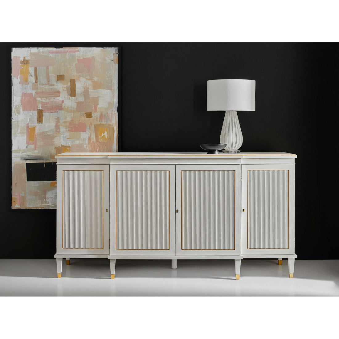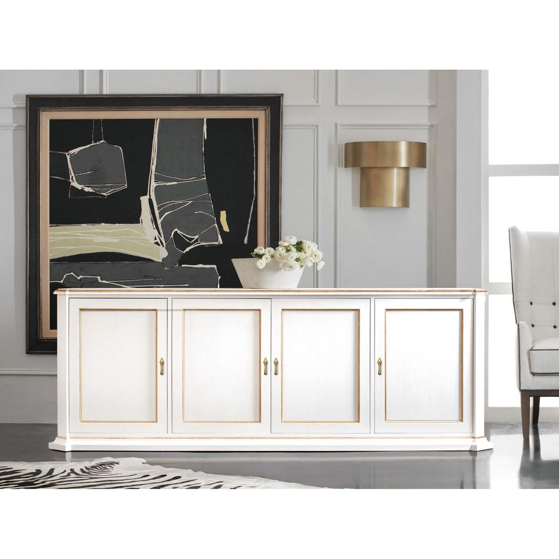 Covington Credenza Dimensions: 88w x 22d x 32h Features: Brass Hardware Materials: White Painted Finish; Gold Paint Accents...