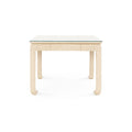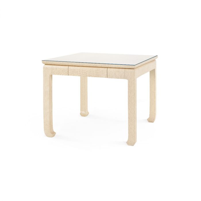 With harmonious proportions and chow-styled feet, the Bethany Game Table is a substantial piece. Finished in a textural, lacquered heavy linen that almost reads like plaster, the Bethany has presence. The square table has four drawers on each side of the table, the perfect place for storing your cards, game pieces, and other knick-knacks. The Bethany is equally welcomed as a neutral moment in a beachy, coastal room like a pool house or as the centerpiece of a casual, brightly lit sunroom. In a small space, like an apartment or cottage, the Bethany Game Table conveniently comes with a glass top, so it could be used as a multi-purpose dining, kitchen table or floated in an office as a work desk. Pigmented Lacquered Heavy Linen & Chow-Style Feet; 4 Drawers with Veneer Interior; Soft Closing Glides; Glass Tempered Top.