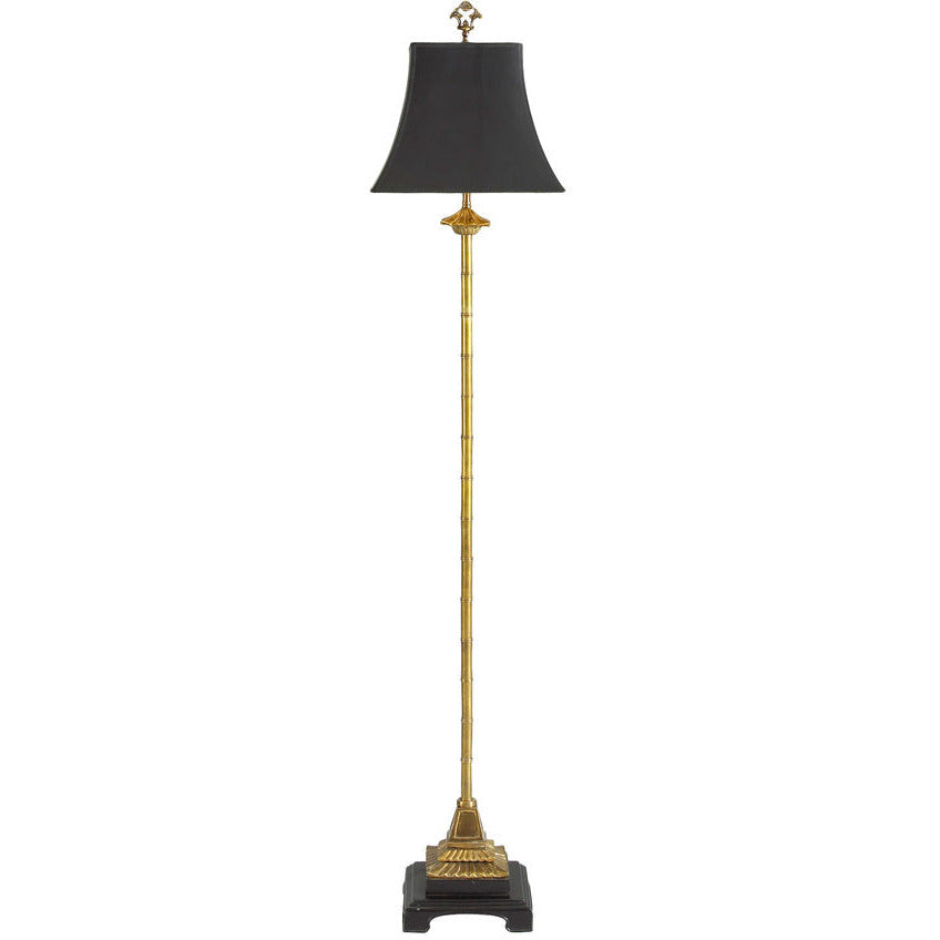 Chelsea House brass faux bamboo column floor lamp on a black base and comes with a black paper shade. 58"h. Max wattage: 100. Switch type: one way. Brought to you by deGuise Interiors.