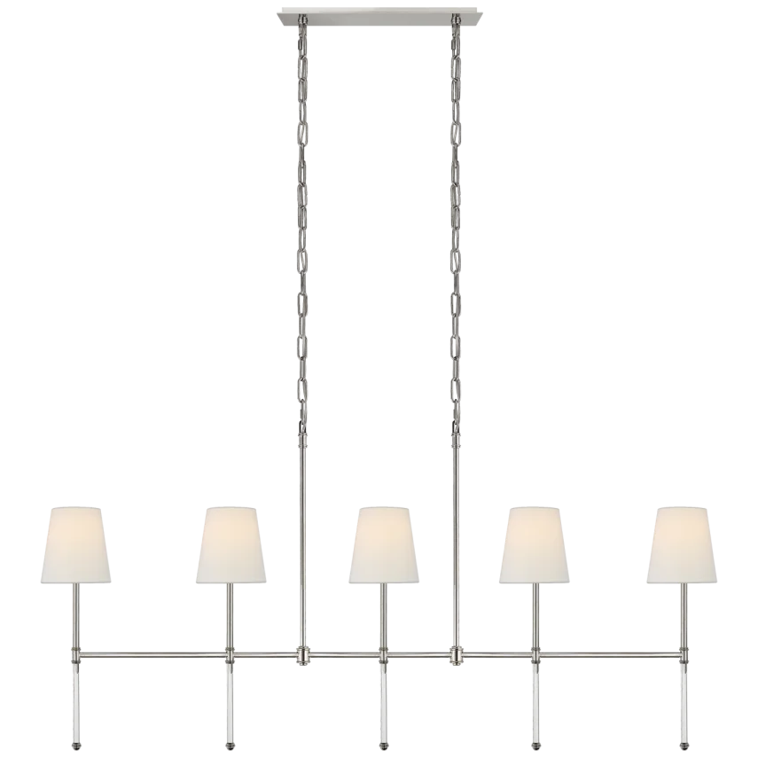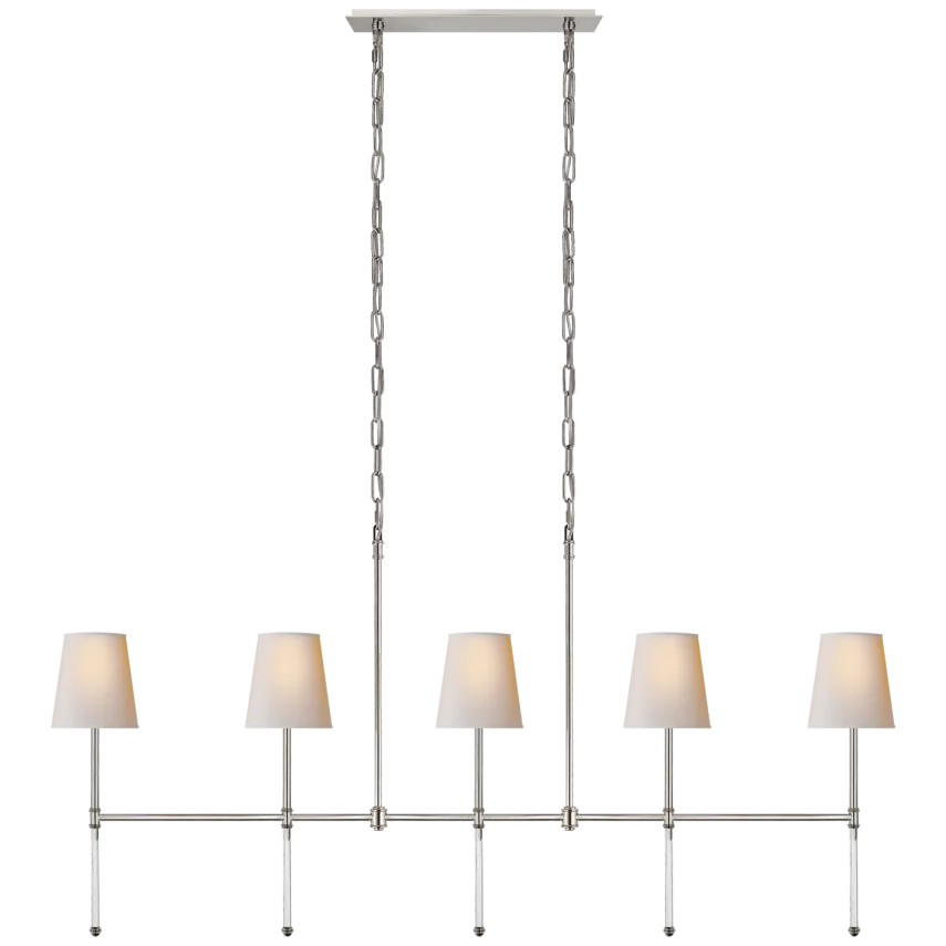 Camille Medium Linear Chandelier comes in hand-rubbed antique brass, bronze, and polished nickel with either natural paper or linen shades.