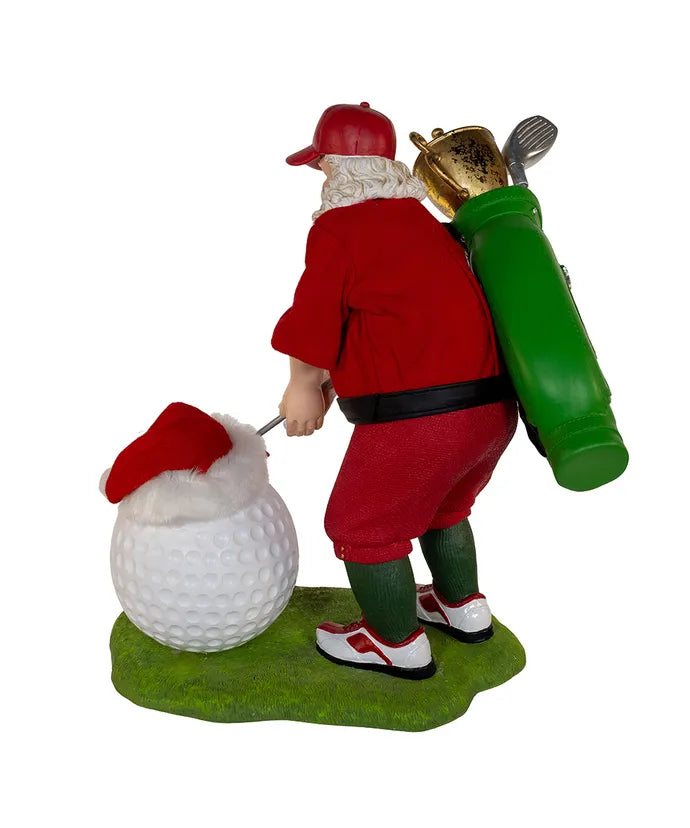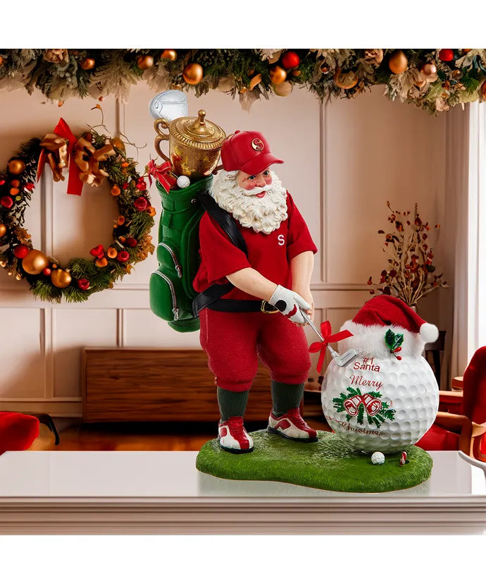 Kurt Adler's 11" Fabriché™ Golfer Santa With Oversized Golf Ball, a charming and sporty addition to your holiday decor that combines the beloved traditions of Santa Claus with the enthusiasm for golf. Crafted with meticulous attention to detail, this unique figurine celebrates the joy of the game and the festive spirit of the holiday season. Standing at a delightful 11 inches tall, this Fabriché™ figurine features Santa Claus dressed in a red golf outfit with a red cap, but with a playful twist. Santa is captured mid-swing with a golf club in hand, ready to take a shot with an oversized golf ball that's nearly as big as he is. His cheerful facial expression and dynamic pose capture the excitement and spirit of the golf course. Place this table piece on your mantel, tabletop, or as a centerpiece in your holiday display to celebrate the love of golf and the playful side of Santa Claus. Whether you're an avid golfer or simply want to add a touch of sporty fun to your holiday decorations, this figurine is a lighthearted reminder of the joy of the game and the spirit of the season.