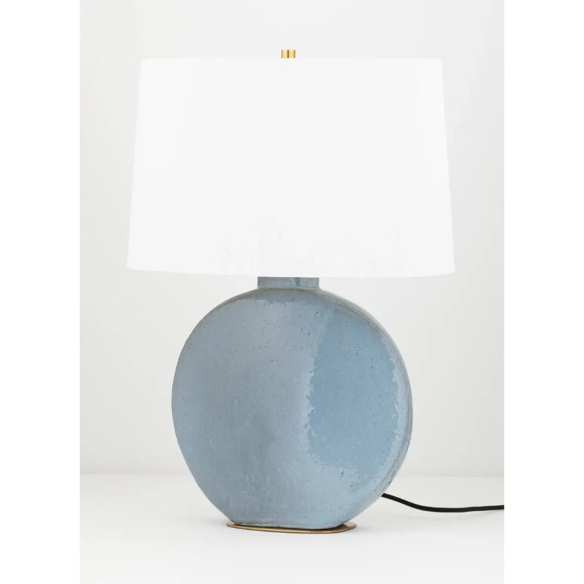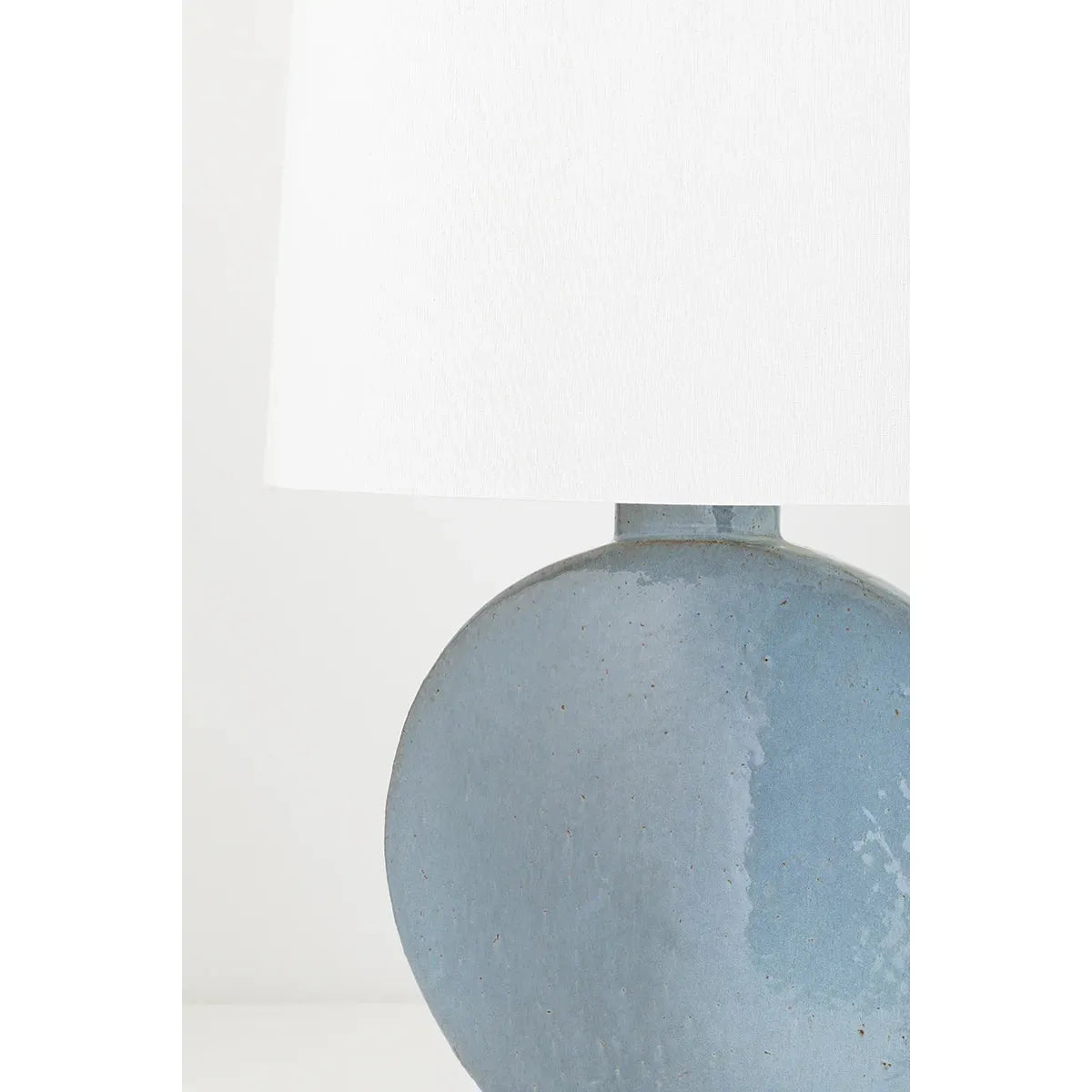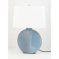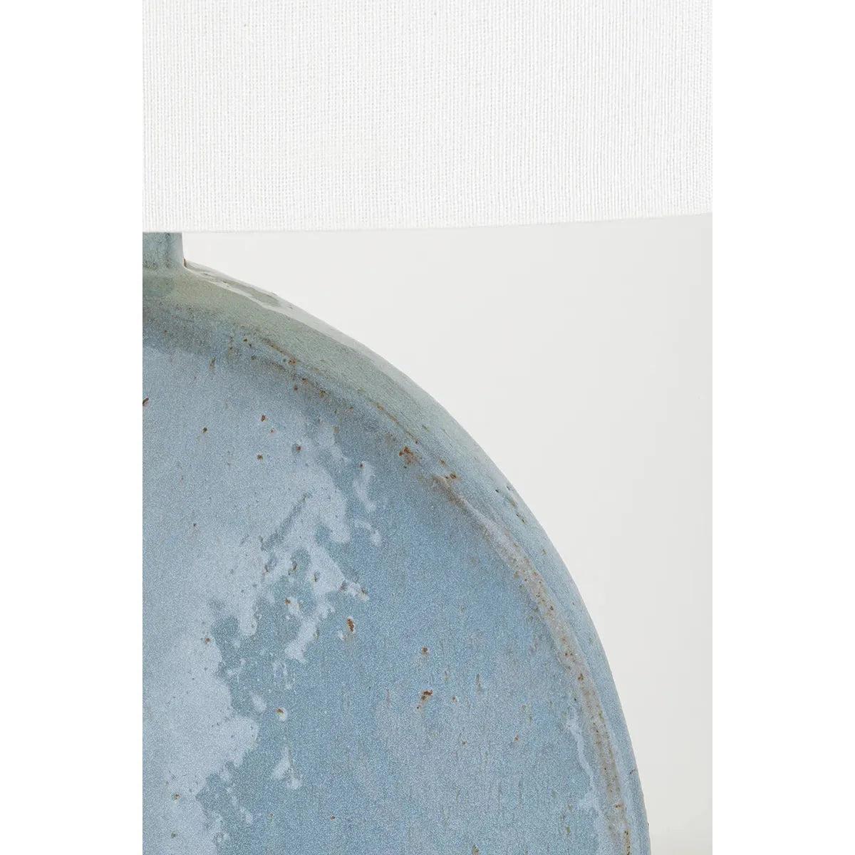 Striking blue grey lamp with white linen shade.