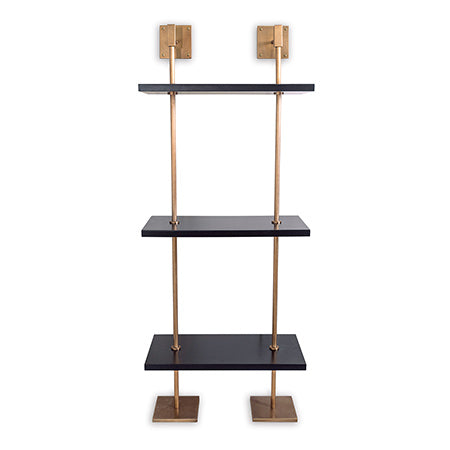 Modern multi-tier shelf in aged brass and black, details urban simplicity with burnished finishes.