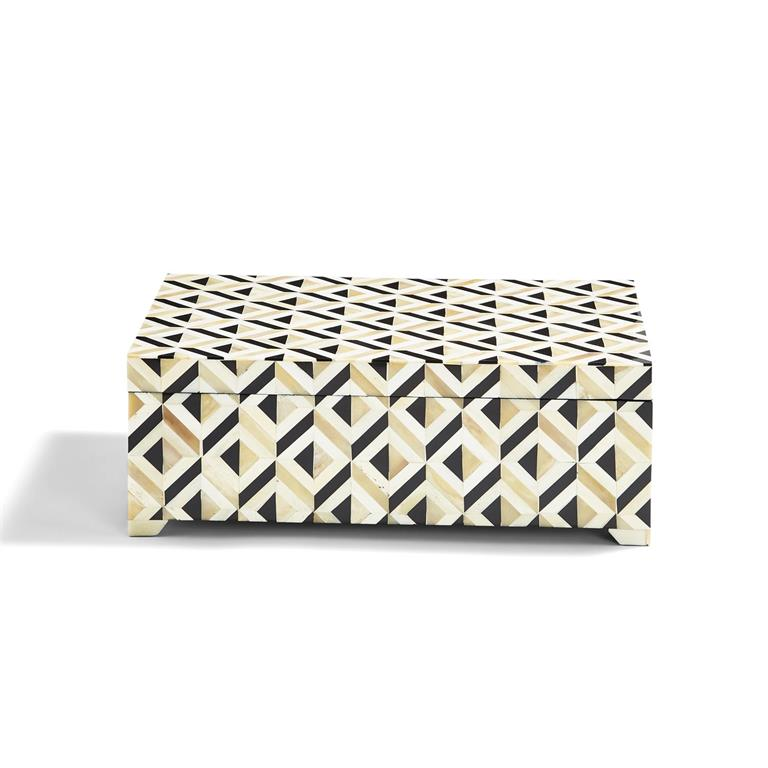 This mosaic box is crafted with both bone and resin that come together to form this gorgeous pattern. Accented with little feet to put this box on a pedestal it is a gorgeous and neutral addition to any home.