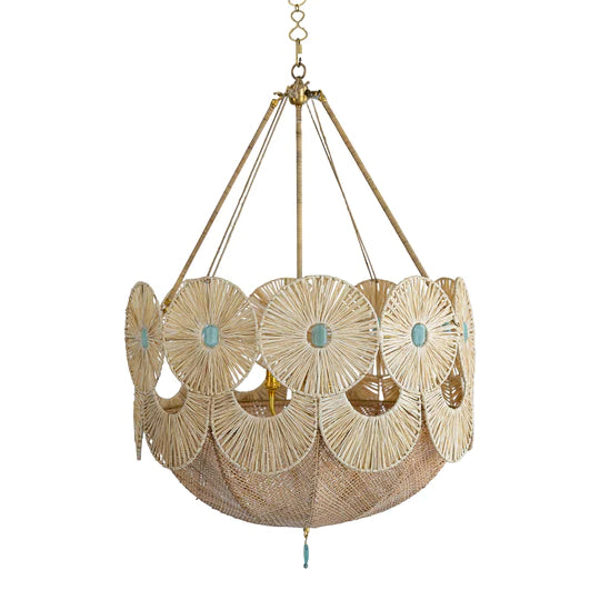 Adorn your room with the ethereal beauty of the Robbie Chandelier. This exquisite rattan chandelier with touches of Skylight Agate is sure to summon an allure of serene, timeless sophistication. Its delicate intricacies will give your living space a touch of refinement, making it a radiant centerpiece.