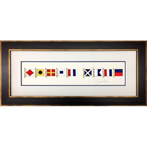 Signed Signal Flag print by Charles Leonard. Matted with wood frame. Flags spell First Mate.
