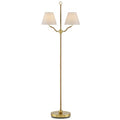 Tom Caldwell created a light profile for the Sirocco Floor Lamp and wrapped all but the main decorative elements in jute rope. These include the ring at its apex, the small globes at its base and the one connecting the forked arms, and the base itself. Made of steel and natural plated antique brass, the rope floor lamp is fitted with two off-white linen shades. This is a petite floor lamp designed to be a decorative accent in a space.