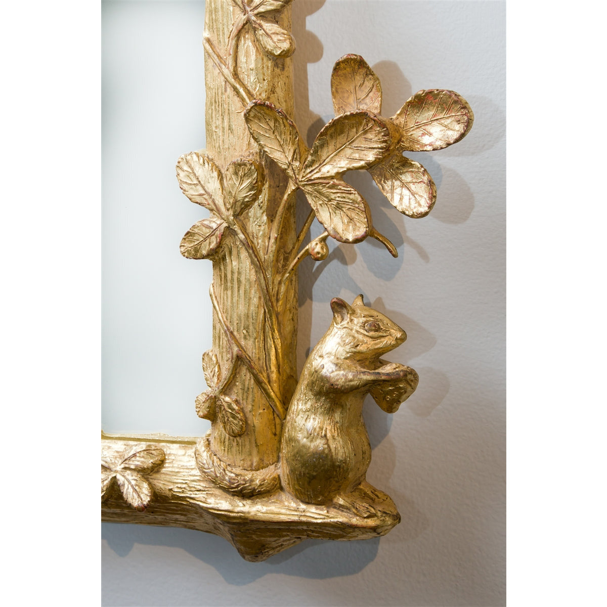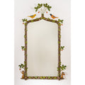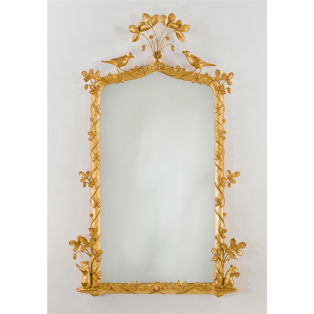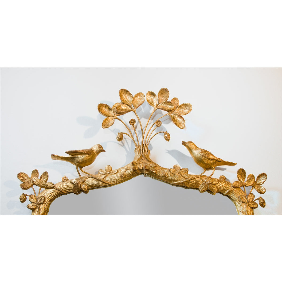 Inspired by William Morris' fabric of the same name, Carol Canner's Strawberry Thief is a masterpiece. Fully sculpted Baltimore orioles and chipmunks reach for tantalizing strawberries, animating a Gothic twig frame. Charming in a Hand-Painted Finish, sophisticated in antique gold or sterling silver leaf. Please contact us for custom color options. **Average lead time is 6-8 weeks for this item.** Available in Gold or Hand Painted Finish. 27 x 44"
