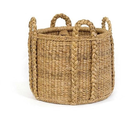 Hand made, harvested rattan basket. Recommended indoor or covered use for longer durability. **The lead time on this item is approximately 10 weeks** Hand made. Rattan. 4 handles. 24.5 diameter. 20h. 4.5'' handles.