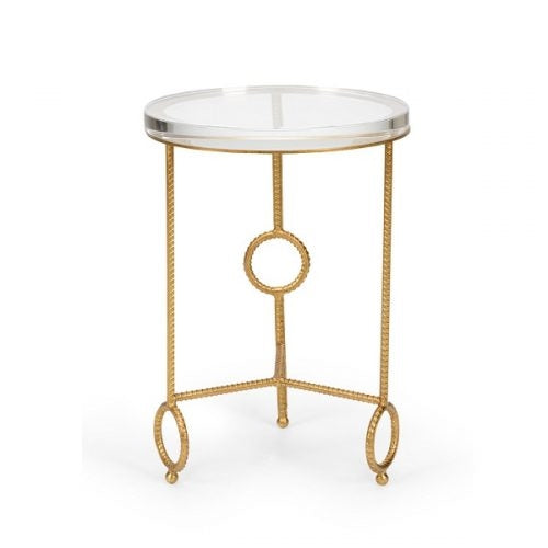 The Yonkers Side Table dons a gold, rope-detailed base an acrylic table top. Gold leaf iron acrylic 15" dia x 21"h